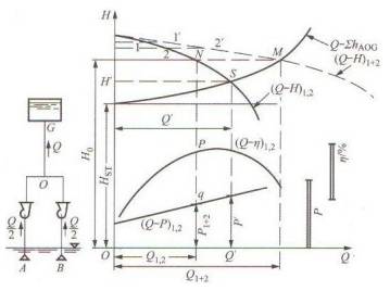 并联时:Q=Q1=Q2 H=H1=H2 即当两台或两台以上水泵并联时,其系统的扬程无大改变,但流量叠加。水泵的串联常用于给水管网加压,室外给水管网的加压泵站即采用水泵串联方式。水泵并联常用于单台水泵不能满足流量要求时,或选择系统流量过大的单台水泵会造成运转费用增加时。并联可根据用水量的多少及用水 高峰调节开启水泵的台数,降低运行成本。采暖系统中循环水泵经常采用并联的方法以满足流量要求,备用水泵也采用并联方式。